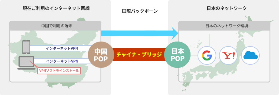 中国でご利用のパソコンやスマーフォン専用のソフトをインストールすることで、日本のネットワーク環境に高速でアクセスすることができます。