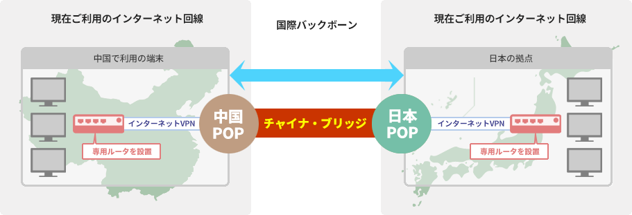 ※チャイナ・ブリッジ回線は4Mbpsを他社と共有するお得なシェアプランとお客様専用に確保する専用帯域プラン(4Mbps~)からお選びいただけます。